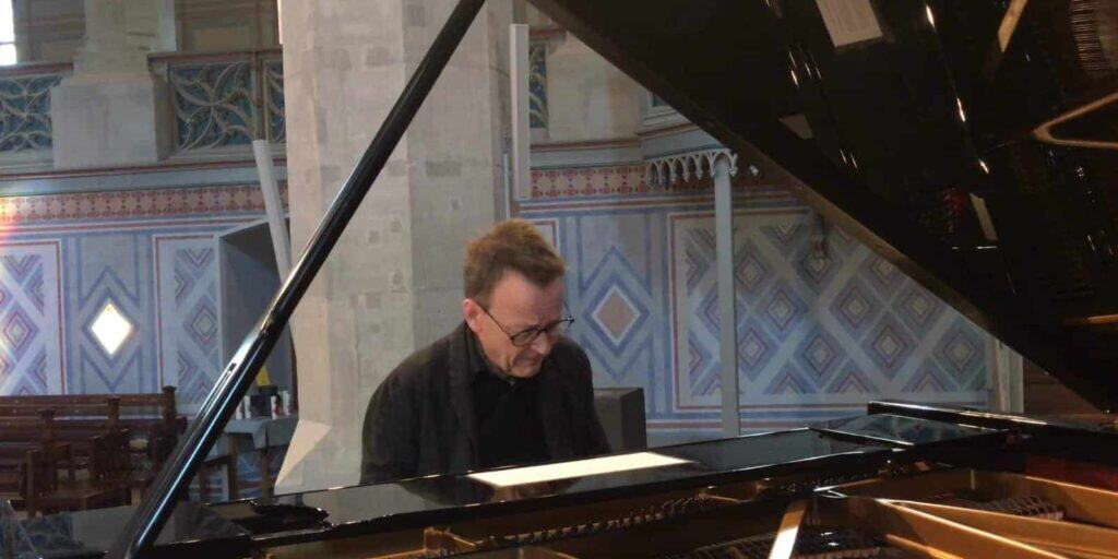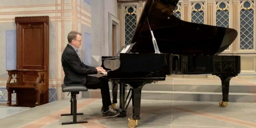 Ein Mann, der auf einem Klavier spielt, begleitet von einem Orchester